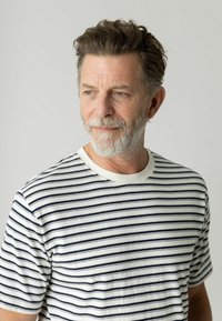 Homme d'âge moyen avec une barbe grise et des cheveux ondulés porte un T-shirt rayé blanc et noir et un jean bleu, debout devant un fond clair uni.