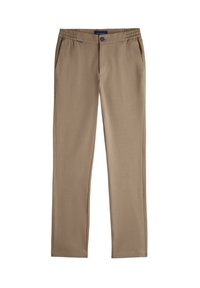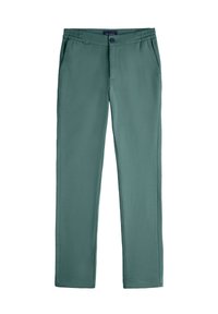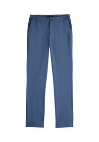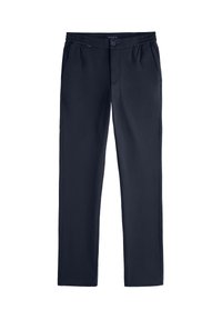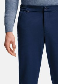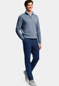 Homme portant un pantalon slim bleu marine, des baskets grises et un pull bleu clair, une main dans la poche, debout sur un fond blanc.