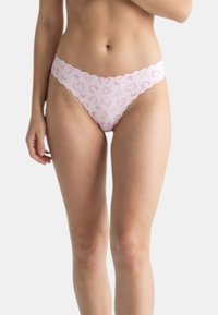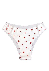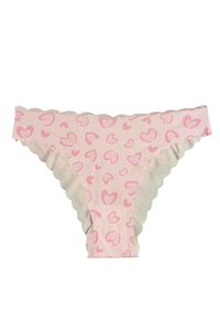 Femme blonde en t-shirt blanc regardant en arrière, portant une culotte rose à motifs de cœurs avec le texte « Mariée » au dos.