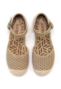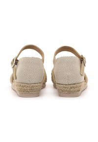 Chaussure style espadrille beige avec une tige présentant un design en maille croisée et des embellissements décoratifs. Bride de cheville avec une boucle.