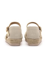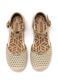 Espadrille dorée et beige avec un design tissé, une bride à la cheville et une semelle en corde tressée. Présente une tige texturée et une semelle plate en caoutchouc.