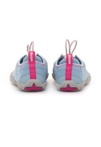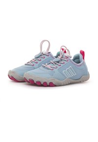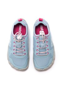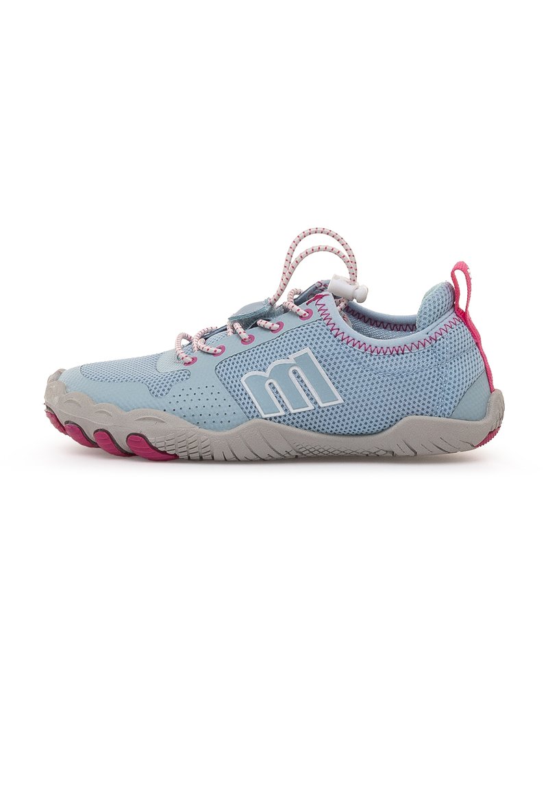 Chaussure en mesh bleu clair avec une semelle grise, des accents roses et des lacets élastiques. Présente un embout texturé et un talon de soutien. Design durable et léger.