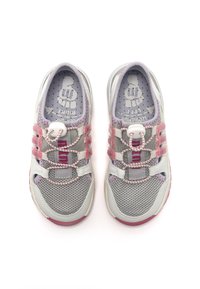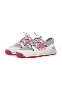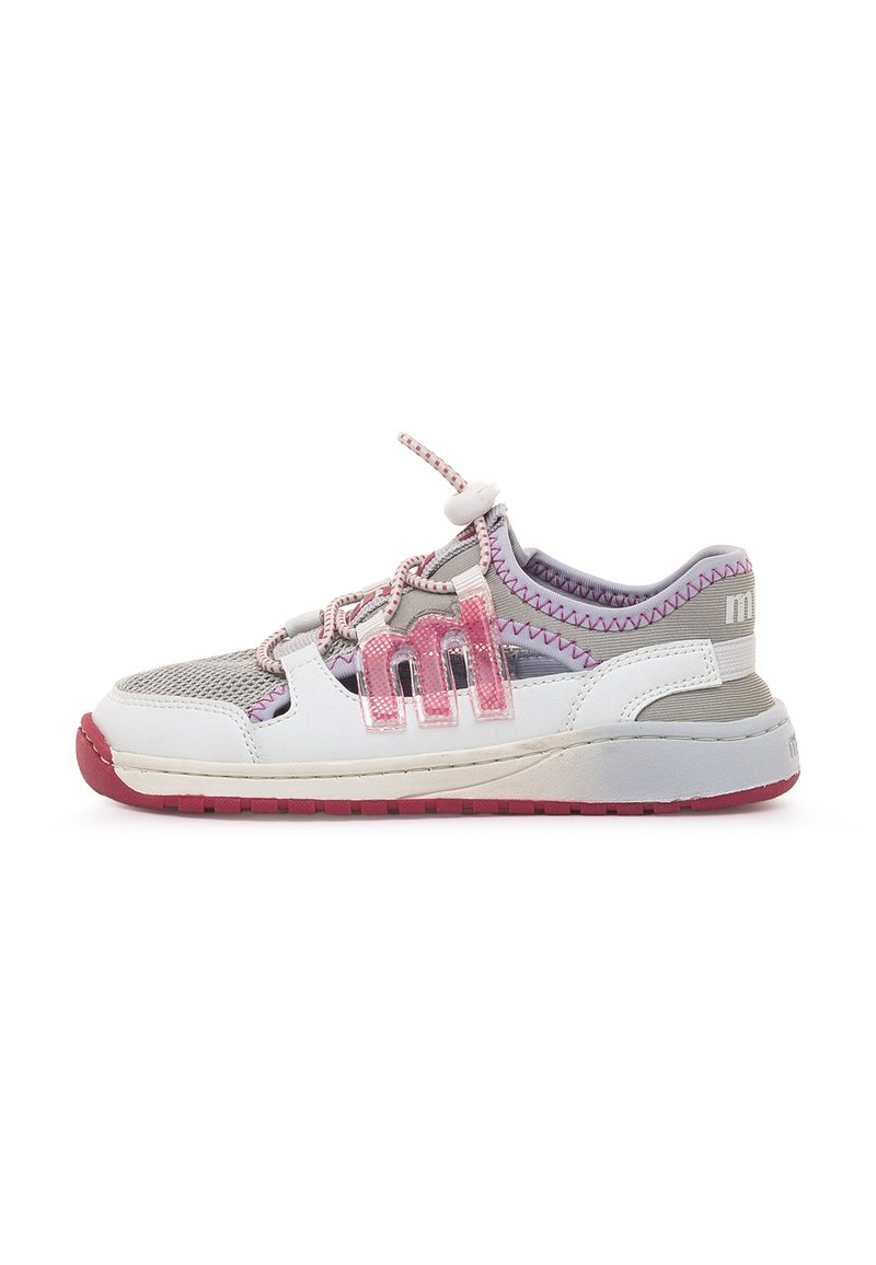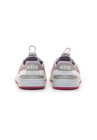 Baskets avec une tige en mesh blanc agrémentée d'accents roses, de panneaux gris, de surfaces texturées et d'un logo translucide. Semelle extérieure en caoutchouc avec une bande de roulement rose.