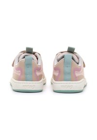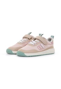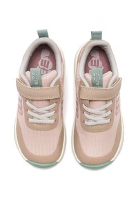 La chaussure présente une tige en maille rose avec des accents beiges, une bride en velcro blanche et une semelle en caoutchouc verte avec une semelle extérieure à relief prononcé pour une bonne adhérence.