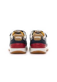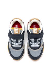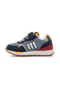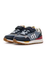 Chaussure de sport pour enfants avec des couleurs marine, gris, rouge et jaune, présentant une sangle Velcro, des lacets et un logo "m" sur le côté.