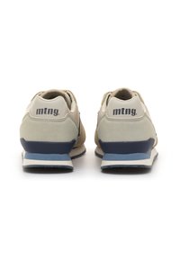 Baskets beiges dotées d'un mélange de matériaux textiles et en daim, avec un logo prominent, des lacets crème, et des accents bleu marine sur la semelle et le talon.