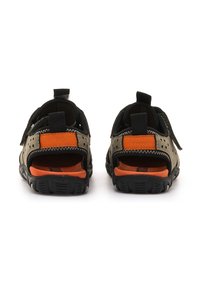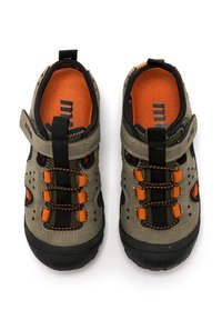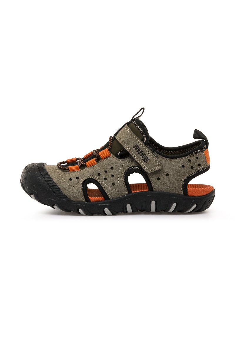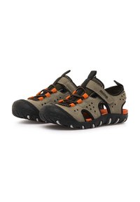 Sandale grise et noire avec des accents orange, présentant une tige texturée, une bride ajustable et des découpes pour la respirabilité. Semelle en caoutchouc.