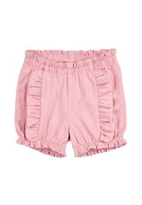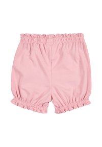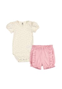 Body bébé crème à manches courtes avec un petit imprimé floral, accompagné d'un short bébé rose à taille élastique et volantée.