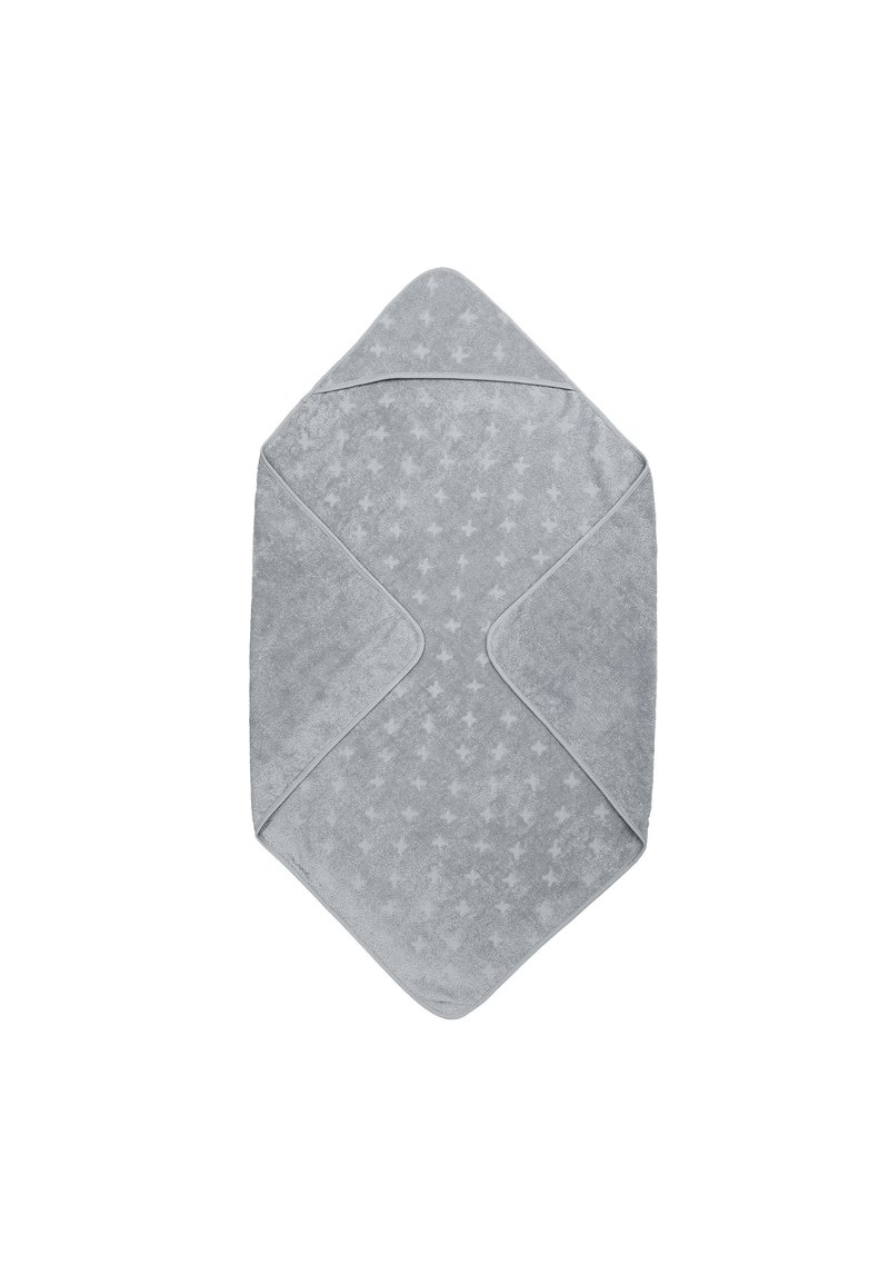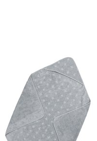 Serviette pour bébé grise à capuche avec un motif d'étoiles subtil, pliée pour montrer sa capuche triangulaire et ses bords angulaires.