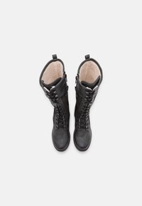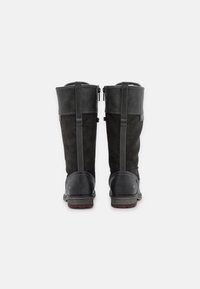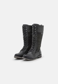 Bottes genouillères en cuir noir et en daim avec lacets, fermeture éclair et surface texturée ; présentant des accessoires en métal argenté et un capuchon de pied contrastant.