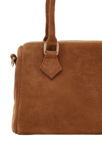 Sac à main en daim marron avec deux anses supérieures, une bandoulière amovible et une fermeture éclair sur fond blanc.