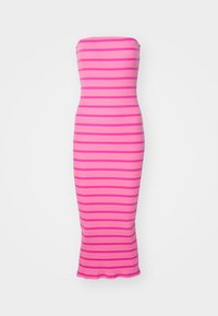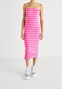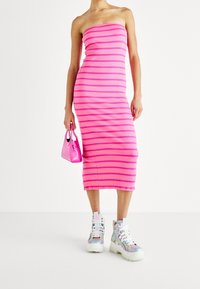 Femme portant une robe midi sans bretelles rose avec des rayures horizontales et des baskets plateforme holographiques, se tenant sur un sol blanc uni.