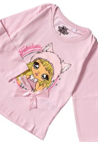 Chemise rose à manches longues pour enfant avec illustration d’une fille en dessin animé portant un chapeau à oreilles de chat, texte "Fabulous", petits strass et un nœud en satin à l’avant.