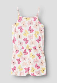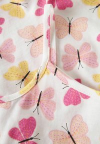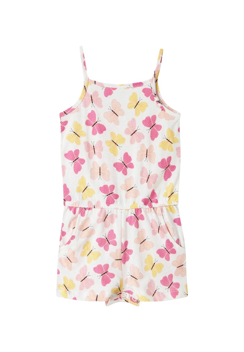 Combinaison blanche sans manches avec motifs de papillons roses, jaunes et pêche, taille élastique, poches latérales et boutons pression au bas.