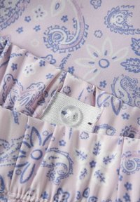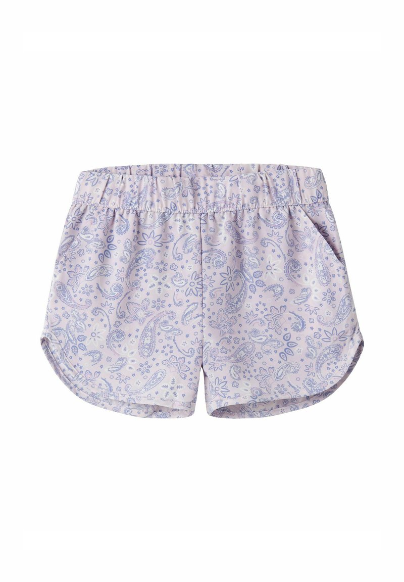 Shorts à taille élastique violet clair avec poches, présentant un motif délicat paisley et floral dans des tons violets plus foncés.