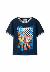 Garçon blond souriant debout portant un t-shirt bleu Paw Patrol, un short en jean foncé et des baskets bleues avec des accents jaunes sur fond blanc.