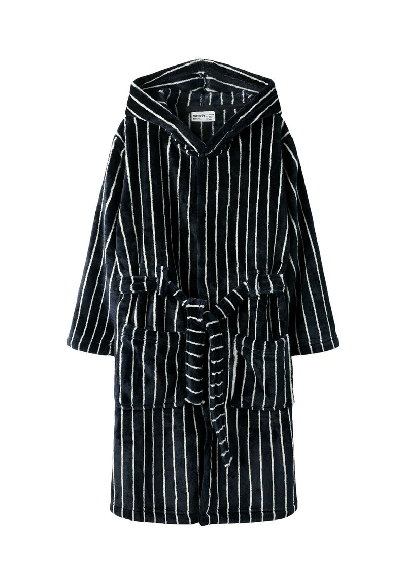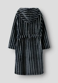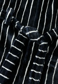 Peignoir à capuche noir avec rayures verticales blanches, deux poches avant, une ceinture à la taille et des manches longues, fabriqué en tissu pelucheux doux.