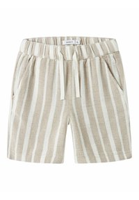 Short en maille rayé vertical bleu clair et blanc avec taille élastique et cordon blanc, doté de poches latérales.