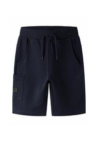 Shorts décontractés gris clair avec taille élastique côtelée, cordon de serrage, deux poches latérales et poche cargo avec étiquette noire sur la jambe gauche.