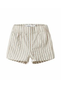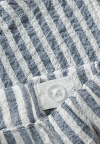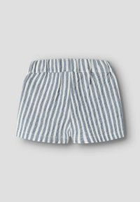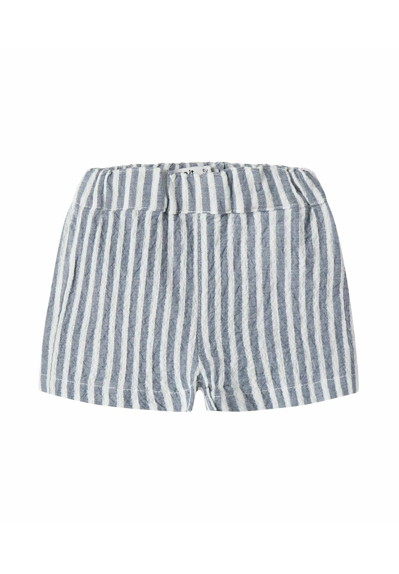 Shorts à taille élastique avec des rayures verticales bleues et blanches, en tissu doux et texturé, au design simple.