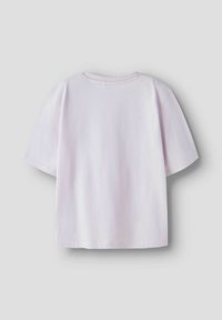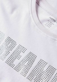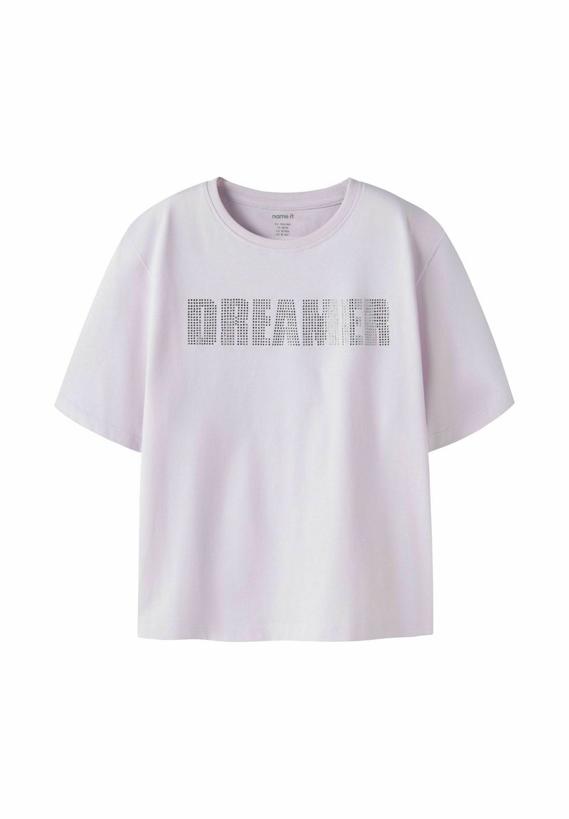 T-shirt à manches courtes violet clair avec le mot "DREAMER" en lettres noires à pois sur la poitrine, col rond, coupe décontractée.
