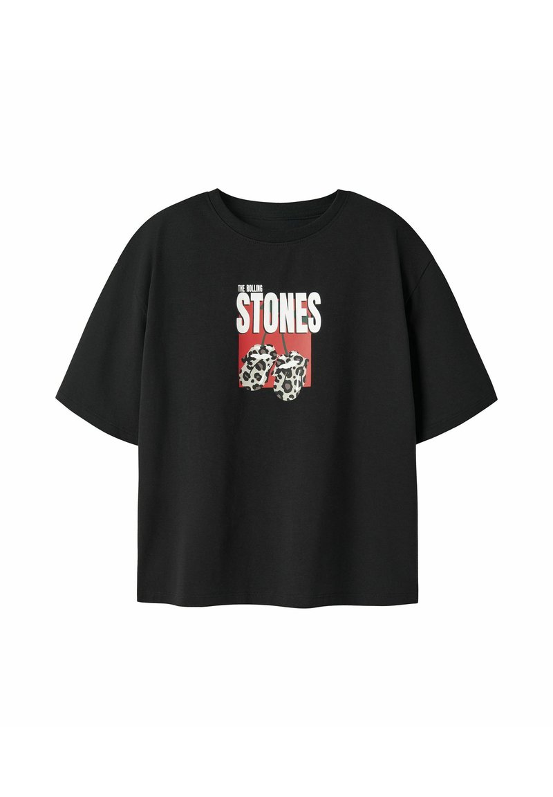 T-shirt noir à manches courtes, avec le texte « The Rolling Stones » au-dessus de cerises imprimées léopard sur un fond rectangulaire rouge.
