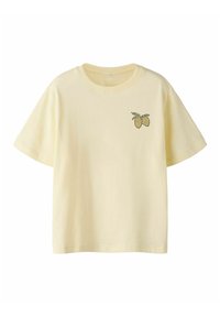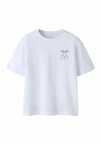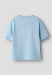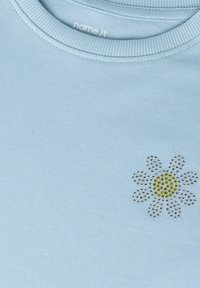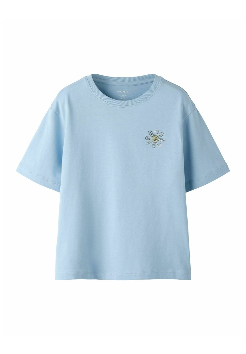 T-shirt bleu clair à manches courtes avec un petit motif de marguerite sur la poitrine gauche, doté d'un col rond et d'une coupe décontractée.