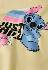 T-shirt jaune à manches courtes avec le personnage de dessin animé bleu Stitch avec des oreilles roses, des fleurs et le texte "JUST CHILL" sous un soleil rayé.