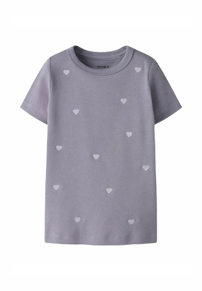 Chemise courte à manches courtes en tissu côtelé violet clair avec de petits cœurs blancs brodés éparpillés sur le devant.