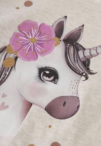 T-shirt beige clair pour tout-petit avec une impression de tête de licorne portant une grande fleur rose et des accents pailletés dorés.