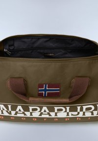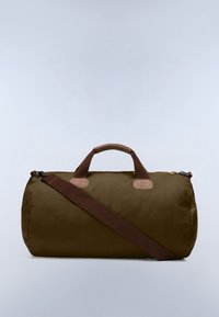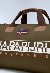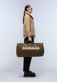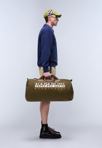 Homme portant une casquette verte, un sweat-shirt bleu marine, un short beige, des chaussures noires, portant un sac de voyage Napapijri vert olive par ses poignées sur le côté.