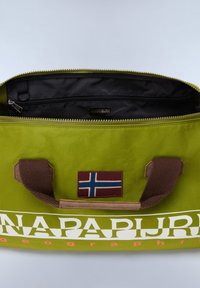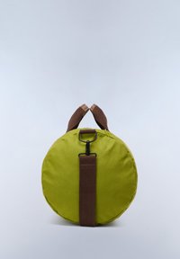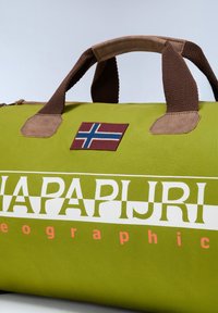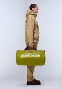 Homme en veste et pantalon beige tenant un grand sac de voyage Napapijri vert, debout de profil devant un fond clair uni.