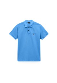 Polo bleu clair à manches courtes, avec une patte de boutonnage à deux boutons et un petit logo. Le tissu semble texturé et respirant.