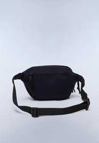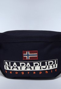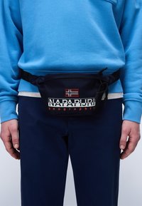Personne portant un sweat-shirt bleu et un pantalon bleu marine avec une banane Napapijri noire avec un écusson du drapeau norvégien à la taille.