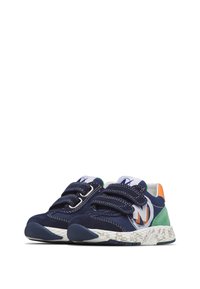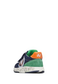 Baskets pour enfants bleu marine avec talon en daim vert, accent orange, semelle blanche et deux bandes velcro bleu marine, avec un logo circulaire blanc et orange.