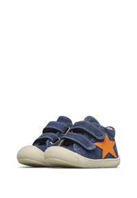 Chaussure de sport bleue pour tout-petit avec deux brides velcro et une étoile orange sur le côté, dotée d'une semelle en caoutchouc blanche et d'une pointe texturée.