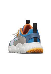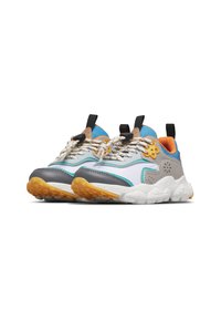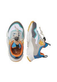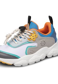 Baskets de sport colorées avec semelle blanche épaisse, panneaux gris et bleus, doublure orange, bordure bleu sarcelle et lacets blancs à fermoir à bascule.