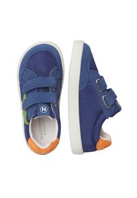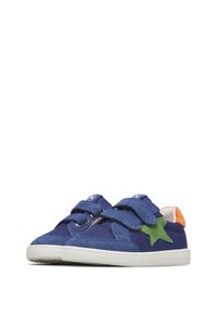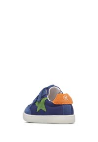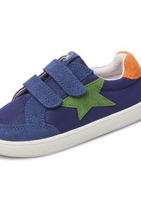Baskets bleu marine pour enfant avec applique étoile verte, languette de talon orange, deux brides bleues à scratch, et semelle blanche.