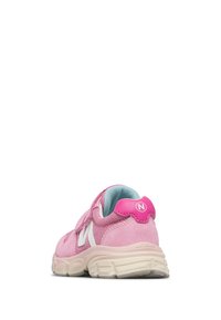 Baskets roses pour enfants avec double fermeture Velcro, logo "N" blanc, empeigne en mesh et suède, semelle texturée beige.