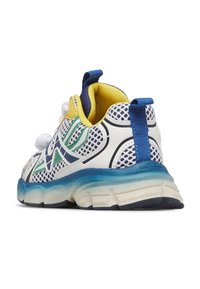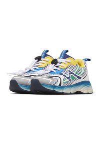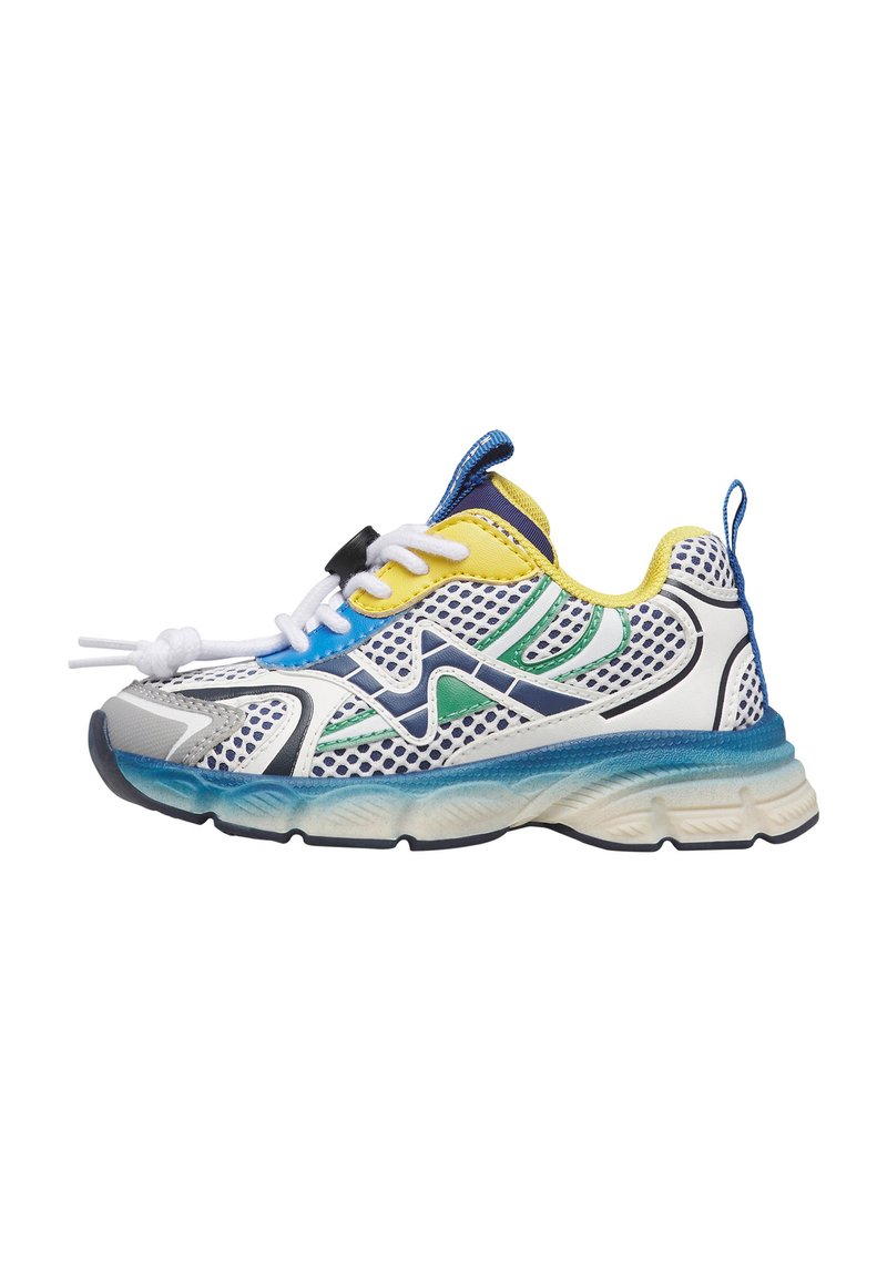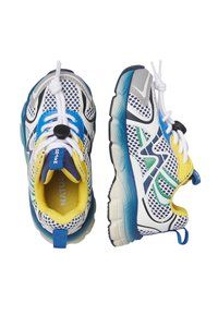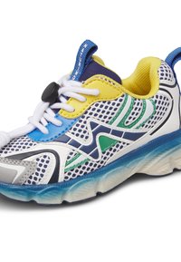 Baskets de sport en maille blanche avec des accents bleus, jaunes, verts et marine, lacets blancs noués, et une semelle épaisse bleue et blanche.
