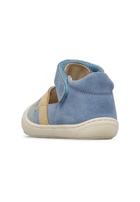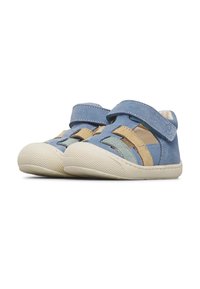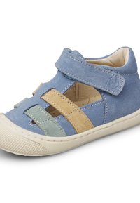Sandale en cuir suédé bleu pour tout-petit avec des brides beige et vert clair, semelle en caoutchouc et fermeture Velcro sur fond blanc.