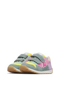 Baskets pour enfants avec double fermeture velcro, en daim vert, maille rose, accents jaunes, et talon violet clair sur une semelle blanche.