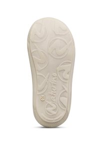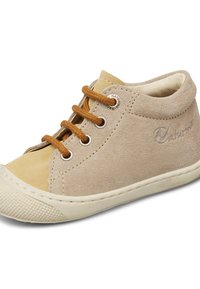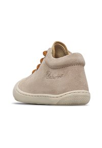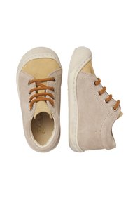 Baskets pour tout-petit en daim beige avec lacets marron, semelle en caoutchouc et bout renforcé, vues de profil sur fond blanc.