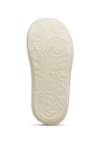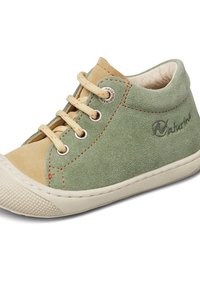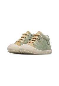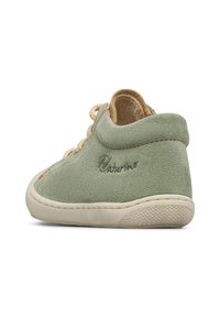 Sneaker basse pour enfant en daim vert clair avec bout renforcé beige, lacets crème et semelle en caoutchouc, vue latérale montrant le logo et les détails de couture.