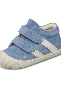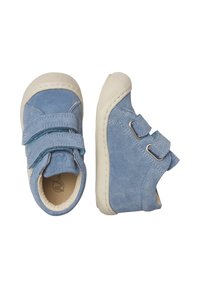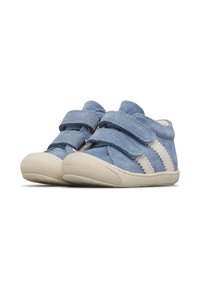 Baskets bleu pour tout-petit avec semelle en caoutchouc blanche, deux bandes Velcro, et deux bandes blanches sur le côté, sur fond blanc.
