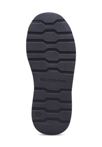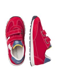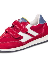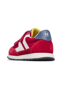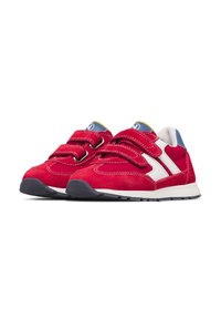 Baskets pour enfants rouges et blanches avec deux sangles en Velcro, talon bleu marine, doublure de la languette jaune et semelle en caoutchouc noire.