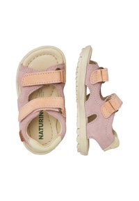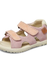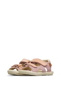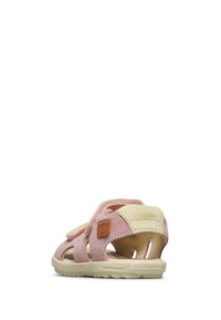 Sandale en daim rose pour enfants avec semelle beige, deux brides ajustables et un renfort rembourré au talon.