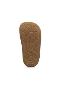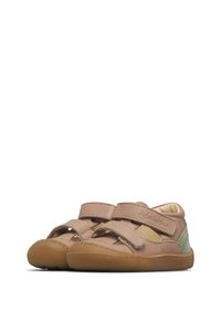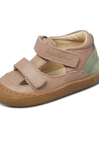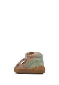 Chaussure pour tout-petit beige avec deux sangles velcro réglables, patch de talon en suède vert et semelle en caoutchouc texturée marron.