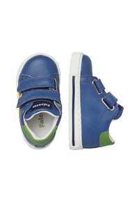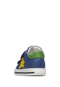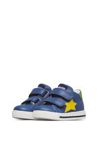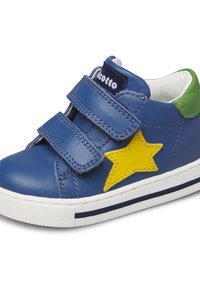 Baskets bleues pour enfants avec deux bandes auto-agrippantes, étoile jaune sur le côté, talon vert et semelle blanche avec liseré bleu marine.