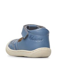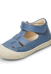 Sandale pour enfant en cuir bleu avec un bout fermé, des découpes pour la ventilation et une sangle réglable en Velcro. Semelle en caoutchouc pour une meilleure adhérence.